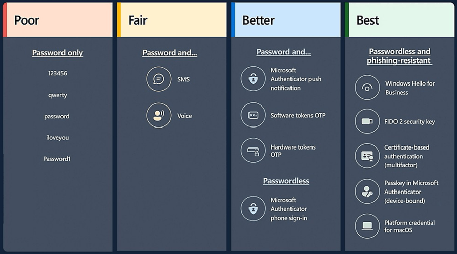 In Microsoft 365 gilt die biometrische Authentifizierung (Fingerabdruck- oder Gesichtserkennung) über Windows Hello for Business als Goldstandard für moderne Sicherheit. Dies schützt Ihr Konto, indem das Passwort durch ein einzigartiges, gerätegebundenes kryptografisches Verfahren ersetzt wird. Weitere empfehlenswerte Optionen neben Windows Hello for Business finden Sie im Bild 1.